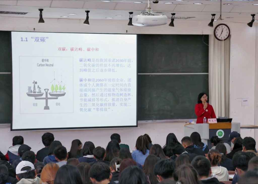 首先,邓志华老师为同学们介绍了中国减碳路线“三步走”方针以及“碳达峰十大行动”,引导同学们树立绿色低碳、节能先行的生活理念。同时用通俗易懂的语言讲解了生态文明的概念以及习近平生态文明思想的主要内容。讲座上,邓老师阐述了当前生态环境面临的严峻形势,并进一步探讨了老员工提升生态文明素养的方法和策略,邓老师强调:“人与自然相处的首要态度是尊重自然,要对自然怀有敬畏之心、感恩之情、报恩之意,尊重自然界的创造和存在,不凌驾于自然之上。”讲座最后,邓老师希望青年学子能将生态文明思想理念内化于心,外化于行。