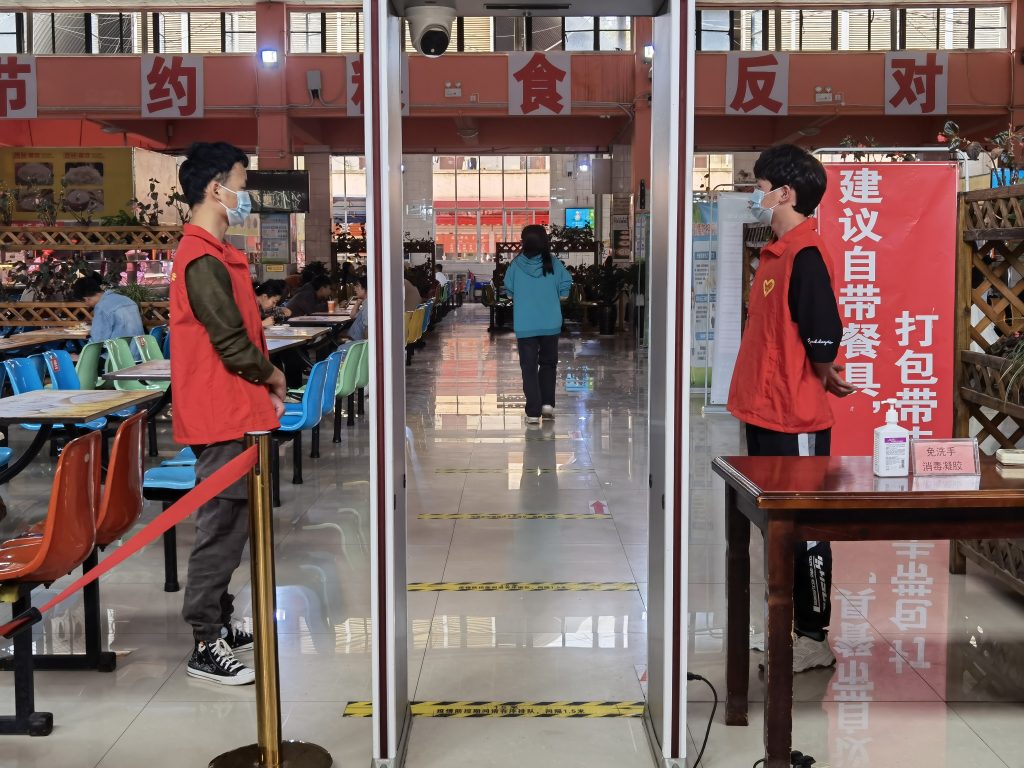 疫情面前显真情,助人为乐暖人心。2022年4月11日起,生态与环境学院开始在校内各个食堂设立值班点,推进校园疫情防控常态化,宣传好人好事以及奉献精神,维持食堂用餐秩序。志愿者们穿上执勤服、戴上口罩,投入到推进疫情防控常态化的工作中,他们分布在食堂的各个门口,坚守在自己的岗位上,有条不紊地进行工作,提醒进出的同学佩戴好口罩,测量体温,为校园疫情防控工作贡献出自己的力量。为营造健康安全的校园环境,学校还在公共场所的门口准备了酒精、免洗洗手液、测枪等防疫物资。工作人员还会每日对校园宿舍、教室、厕所等公共区域进行全面消杀,做到全面消毒、不留死角。
