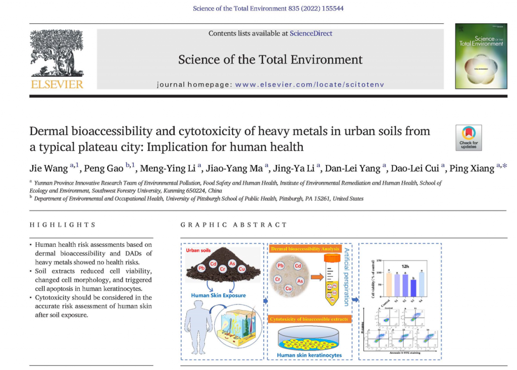 近日,生态与环境学院2020级生态学专业硕士研究生汪洁同学为第一作者,向萍研究员为通讯作者,西南林业老员工态与环境学院为第一单位,在生态环境领域Top期刊Science of the Total Environment(IF2022=10.753)发表典型高原城市土壤重金属污染特征与人群暴露健康风险精细化评估相关研究成果:“Dermal bioaccessibility and cytotoxicity of heavy metals in urban soils from a typical plateau city: Implication for human health”。